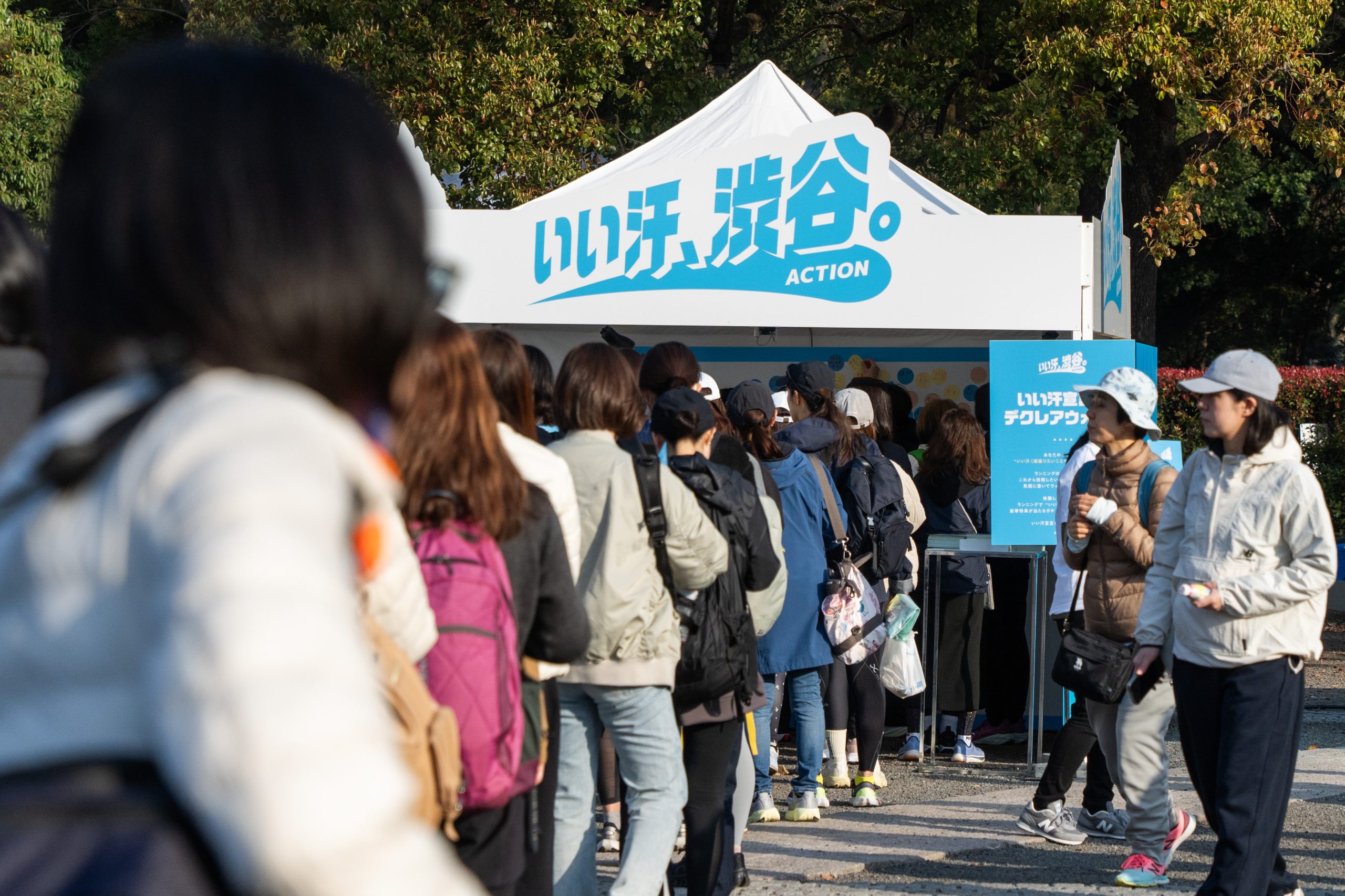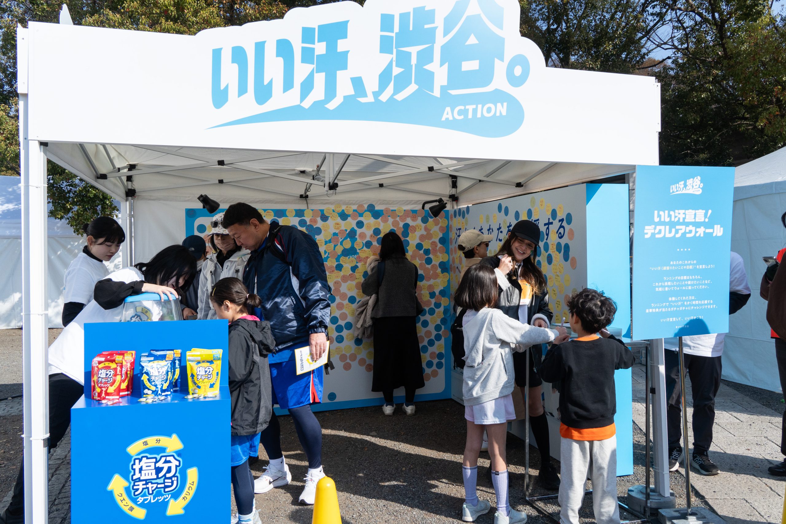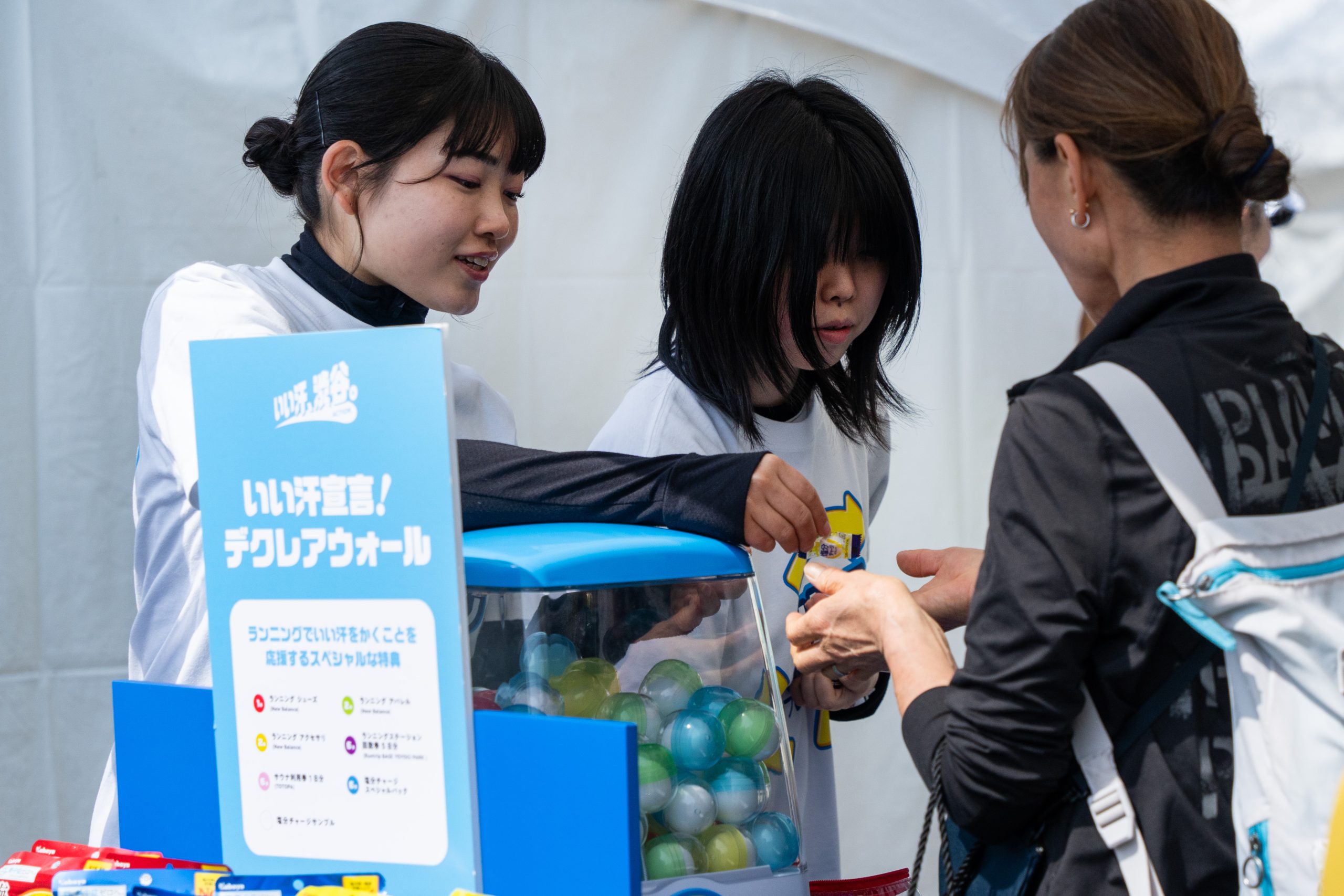 会場には「いい汗、渋谷。アクション」ブースが設置され、参加者はそのブース内の「デクレアウォール」で、自分の目標や想いを書き込み、いい汗アクションを宣言しました。体験人数は1,358人(デクレアステッカー配布数ベース)にのぼり、長蛇の列が途切れることなく、多くの人が集まる人気ブースとなりました。「完走したい」「自己ベストを更新したい」「仲間と楽しみたい」など、さまざまな想いが見える形で共有されました。また、ブースではガチャ施策も実施され、参加者は挑戦の宣言とあわせて景品を手にする体験も楽しみました。