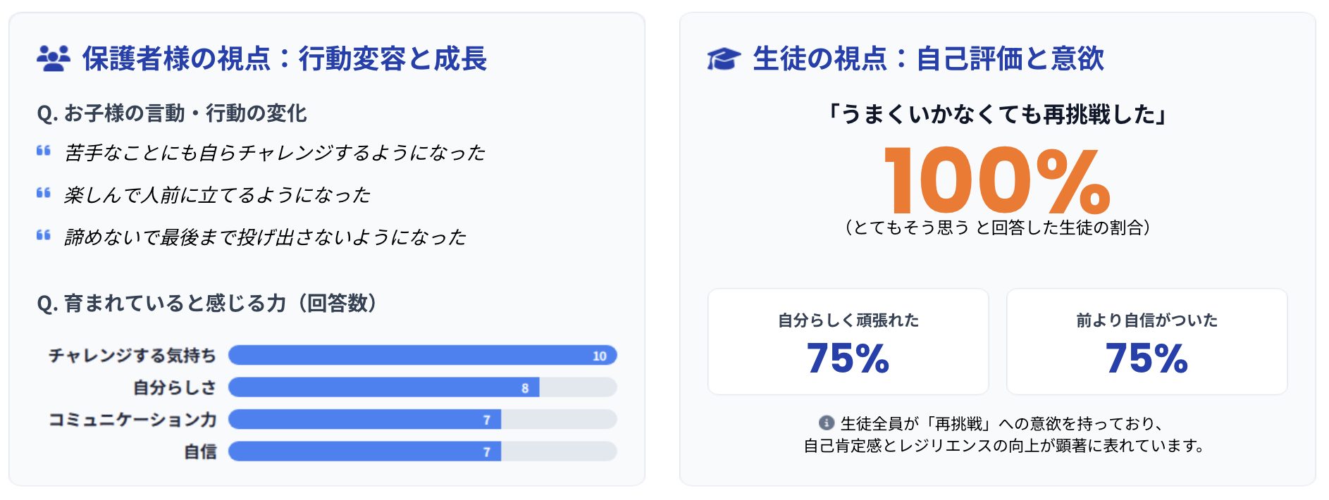 生徒たちへのアンケートでは、「うまくいかなくても再挑戦した」と回答した生徒が100%に達しました。