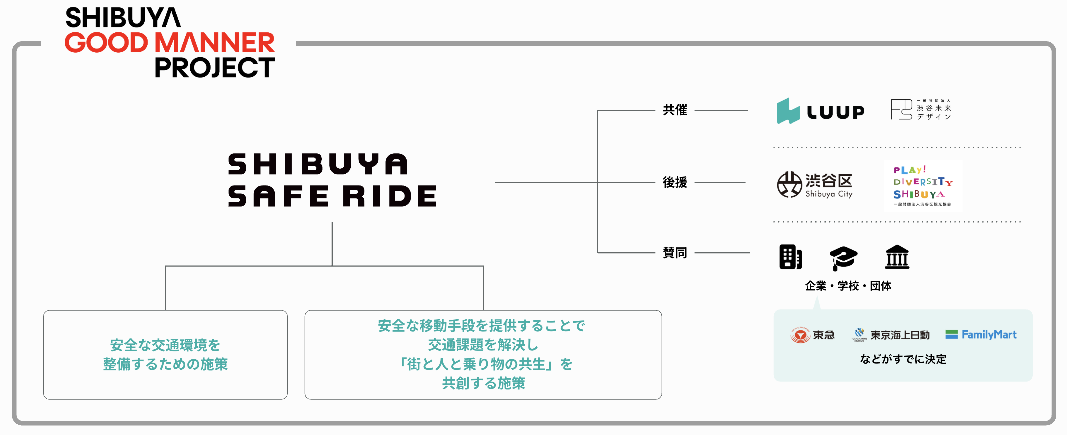 本プロジェクトは、Luupと渋谷未来デザインが共同主幹事として立ち上げた独自の取り組みであり、第一弾施策として、渋谷区および一般社団法人渋谷区観光協会が後援する「渋谷グッドマナープロジェクト」と連携して推進します。また、東急株式会社、東京海上日動火災保険株式会社、株式会社ファミリーマートが、賛同企業として参画します。多様な主体とともに街の安全・快適な移動環境を整え、「街と人と乗り物の共生」を共創することを目指します。