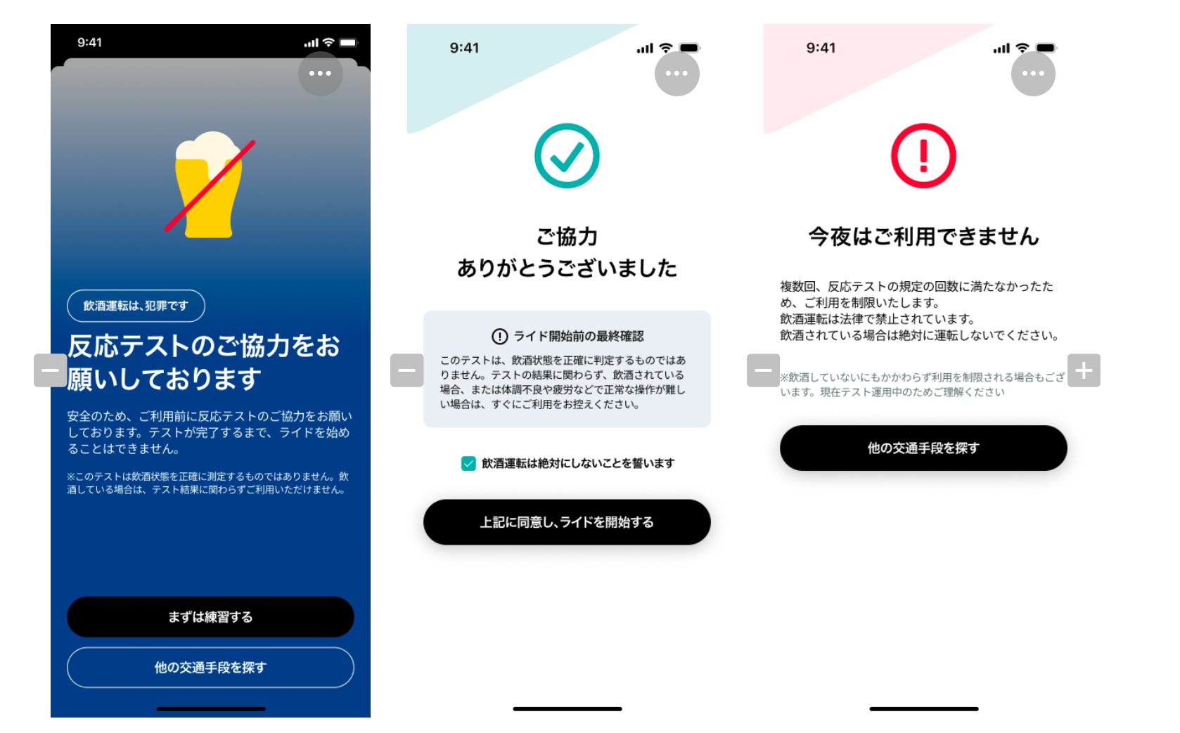 本施策は飲酒運転の防止を目的としており、テスト結果を通じてご自身の状態を確認いただくために提供するものです。なお、テスト結果に関わらず、ライド開始前に飲酒していないことを誓約いただく必要があります。