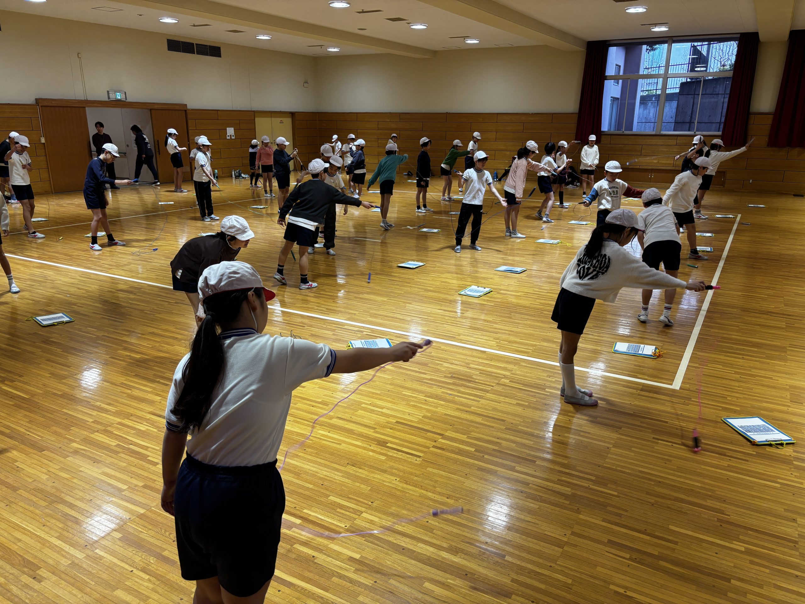 授業の冒頭では、なわとびが苦手な児童でも取り組みやすい「1人なわとび」の技をいくつか紹介しました。その後、子どもたちは自分で挑戦してみたい技を選び、それぞれが工夫しながら練習に取り組みました。失敗を繰り返しながらも、どうすればうまく跳べるかを自ら考え、試す姿が見られました。