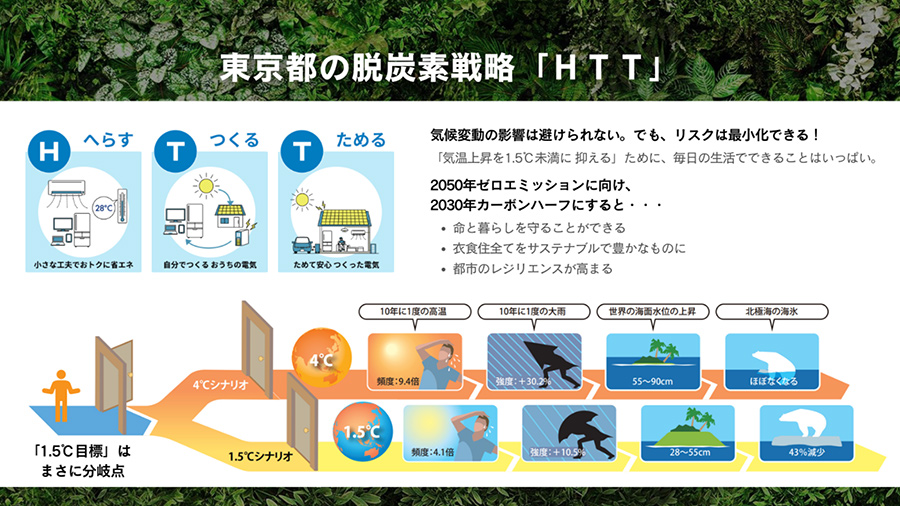 冒頭、本イベントファシリテーターの佐座から、東京都が脱炭素社会の実現に向けて推進している「HTT」アクションについて説明しました。
